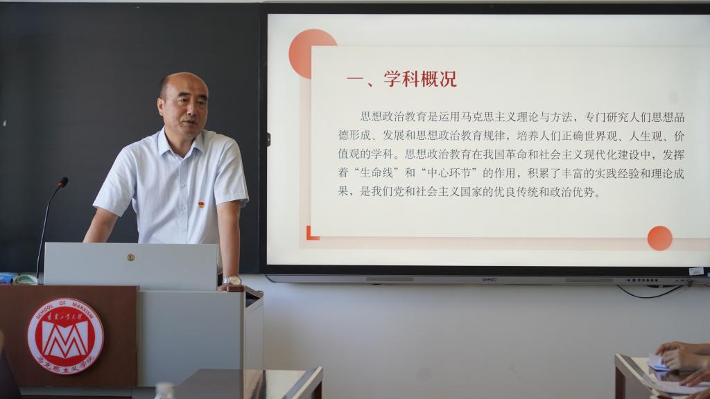 马克思主义基本原理、马克思主义中国化研究、思想政治教育三个研究方向的6名导师对全体研究生依次进行专业教育。镡鹤婧老师简要介绍了马克思主义基本原理这一研究方向主要包括“马克思主义基础理论研究”“马克思主义经典著作研究”“马克思主义基本原理与当代社会发展研究”三个子方向及其主要研究内容。张龙博士则从经典著作研究、基本原理研究、现实问题研究三个维度阐述了马克思主义基本原理这一研究方向的主要研究内容。薄海老师介绍了马克思主义中国化研究这一研究方向的核心内涵与学习路径,并从该方向聚焦的马克思主义基本原理与中国具体实际相结合的历史逻辑、理论逻辑和实践逻辑,具体阐述了这一研究方向的三个研究维度和三门核心课程,指明了学习该方向的意义与价值,并为新生提供了针对性学习建议。高立伟博士从中国国情、马克思主义基本理论、中国共产党历史、近现代世界史等几个方面介绍了马克思主义中国化研究这一研究方向的知识体系。王力尘教授从学科简介、培养目标、业务范围(包括研究范围和课程设置)、相关学科、研究内容等方面介绍了思想政治教育这一研究方向的具体内容和相关要求。佟玲博士则从思想政治教育的由来和发展历程、学科发展现状、相关政策和启示等方面,分享了自己对思想政治教育这一研究方向的见解,并给出推荐书目。