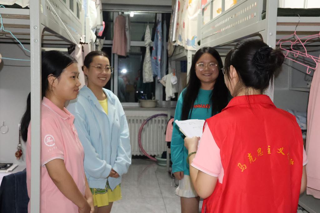 活动现场,老生党员们身着印有“马克思主义学院”标识的红色马甲,带着精心准备的学习生活指南,分别走进各自联系的新生寝室。2025级新同学围绕入学后遇到的学习、科研、日常生活等各类困惑,主动向学长学姐咨询请教。从“如何平衡课程学习与学术阅读”“外语四六级备考有哪些高效方法”,到“评奖评优的申报条件与准备重点”“入党流程与档案转接的注意事项”,问题涵盖新生适应期的多个关键维度。面对新生的疑问,老生党员们充分发挥“过来人”的经验优势,一边认真记录新生提出的问题,一边结合自身经历逐一耐心解答。针对课程学习,老生党员分享了专业核心书目精读技巧与课堂笔记整理方法;谈及科研入门,建议新生从参与组会讨论、撰写论文综述起步,逐步培养研究思维;在评奖评优与入党环节,更是细致梳理了时间节点、材料准备等关键流程,提供了极具针对性的规划建议。